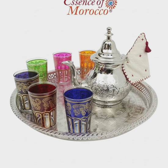 Moroccan Mint Tea Set Large: Silver Tray, Large Teapot, 6 Multicoloured Tea Glasses