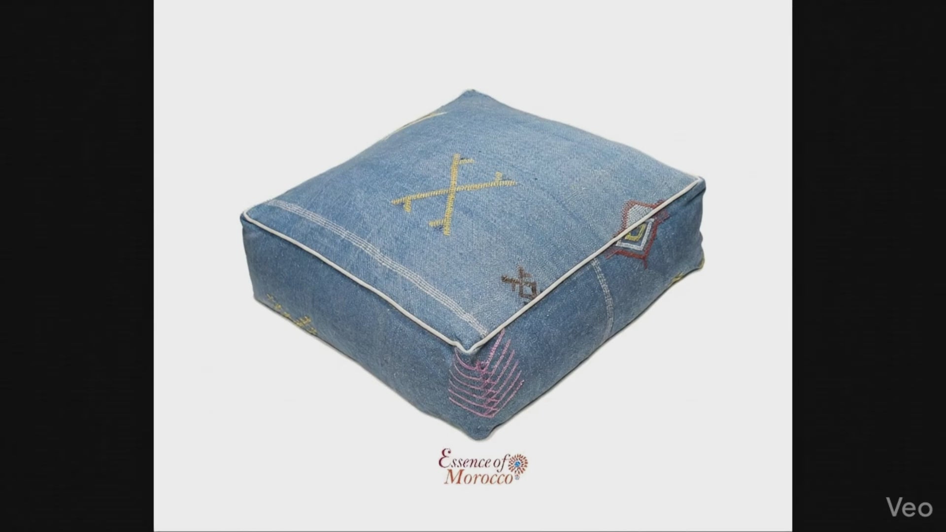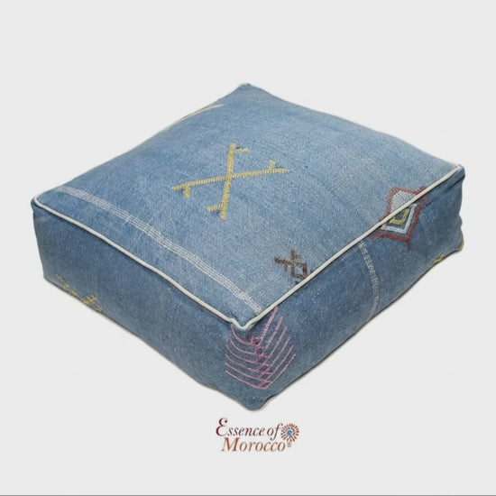 This Moroccan Sabra silk pouf floor cushion cover is handcrafted from a traditional handwoven Sabra silk (also known as cactus silk) rug. Each pouffe features beautifully hand-embroidered motifs, showcasing authentic Moroccan craftsmanship and heritage.