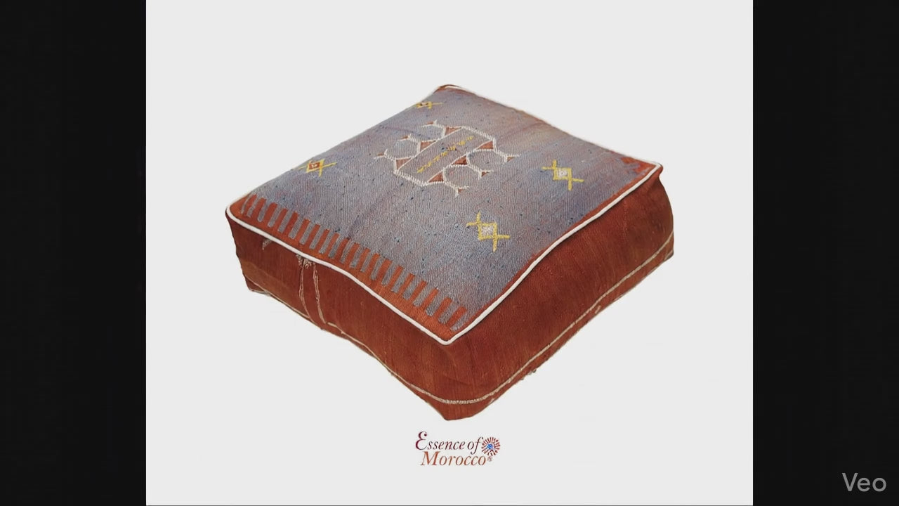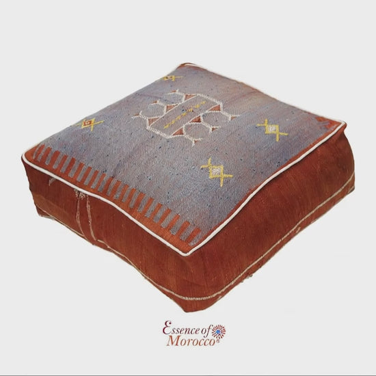 This Moroccan Sabra silk pouf floor cushion cover is handcrafted from a traditional handwoven Sabra silk (also known as cactus silk) rug. Each pouffe features beautifully hand-embroidered motifs, showcasing authentic Moroccan craftsmanship and heritage.