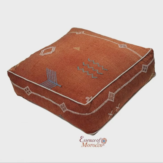 This Moroccan Sabra silk pouf floor cushion cover is handcrafted from a traditional handwoven Sabra silk (also known as cactus silk) rug. Each pouffe features beautifully hand-embroidered motifs, showcasing authentic Moroccan craftsmanship and heritage.
