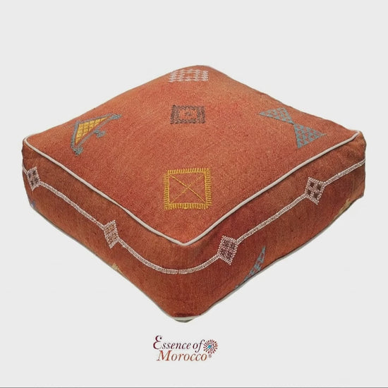 This Moroccan Sabra silk pouf floor cushion cover is handcrafted from a traditional handwoven Sabra silk (also known as cactus silk) rug. Each pouffe features beautifully hand-embroidered motifs, showcasing authentic Moroccan craftsmanship and heritage.