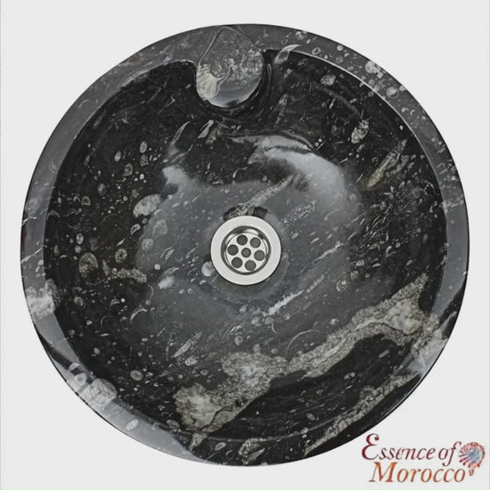Moroccan Sink Washbasin Wash Basin Fossilised Marble Stone Black Hand Carved Free Waste 40 cm (SW843)
