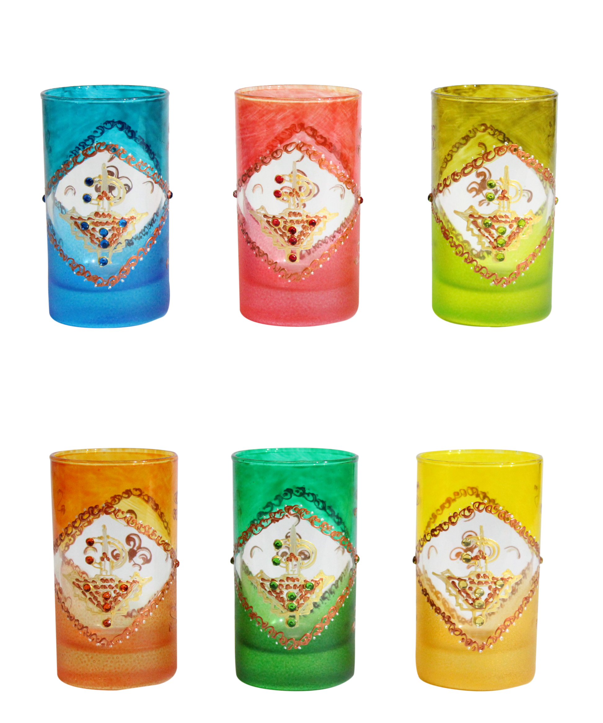 Moroccan tea glasses, multicoloured with gold, beautifully designed in Morocco. Each glass has been delicately painted and decorated by hand with an embossed Berber Fibula adorned with small beads.